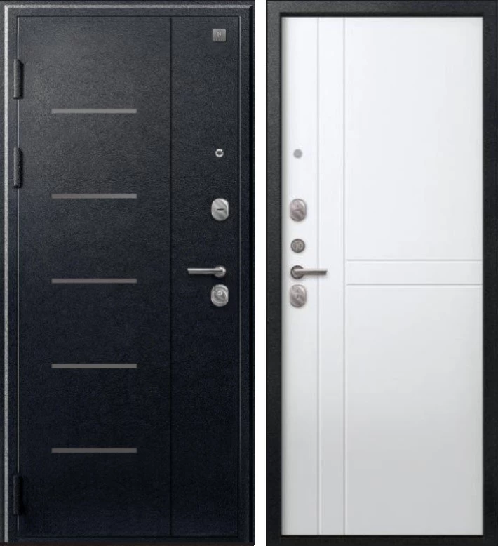 Надежная входная Дверь V-06 Черный муар - Белый премиум класса по цене 38 357 руб. Большая толщина стали защитит от проникновения в ваш дом, квартиру или коттедж. Используется очень качественная фурнитура: замки, цилиндры, ручки, защелки. Покрытие и отделка двери изготовлено под внимательным контролем производителя. Дверь имеет долгий срок службы и гарантию.